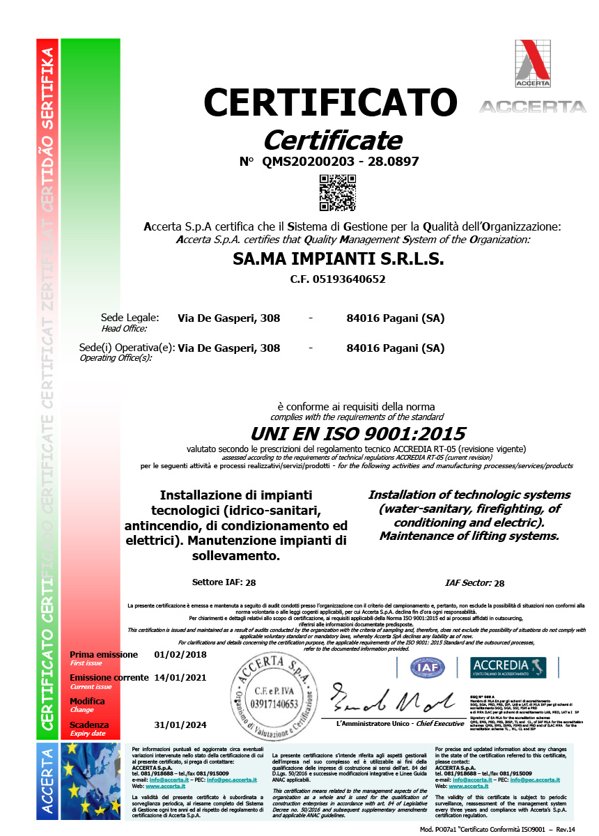 SA.MA. Impianti S.r.l. è un’azienda con sede a Pagani, in provincia di Salerno, che da anni si occupa con successo di progettazione e realizzazione di impianti tecnologici. Nello specifico, provvede alla realizzazione di impiantistica di qualsiasi tipo, dall’elettrico al fotovoltaico, dal meccanico all’idraulico